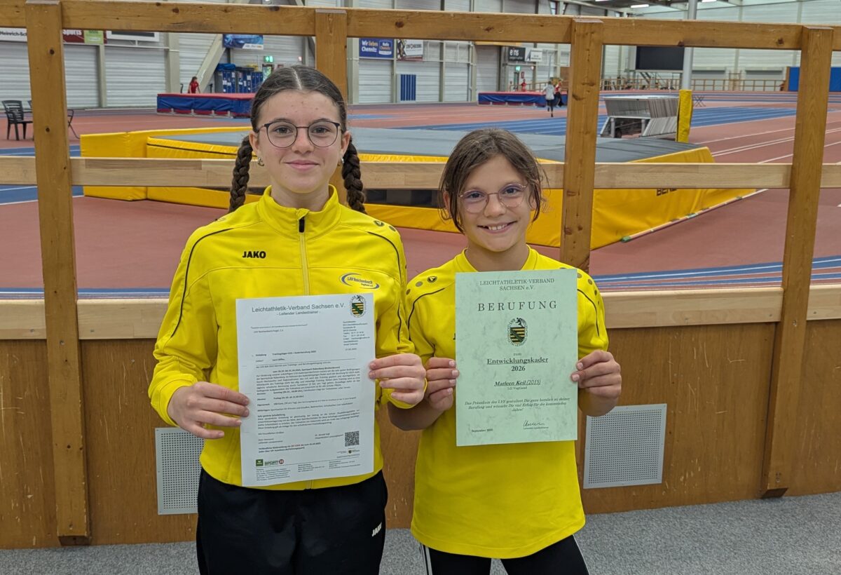 Leni Löffler und Marleen Keil haben beim Fähigkeitstest des Leichtathletik-Verbandes Sachsen in Chemnitz die Berufung in den Kaderkreis der talentiertesten Leichtathleten geschafft. Leni (Altersklasse 13) wurde zum zentralen Trainingslager im Sportpark Rabenberg eingeladen, wo traditionell die neuen Landeskader berufen werden. Marleen (Altersklasse 10) erhielt nach dem Test die Urkunde für die Berufung in den Entwicklungs-Kader. Beide hatten sich im Vorfeld …
